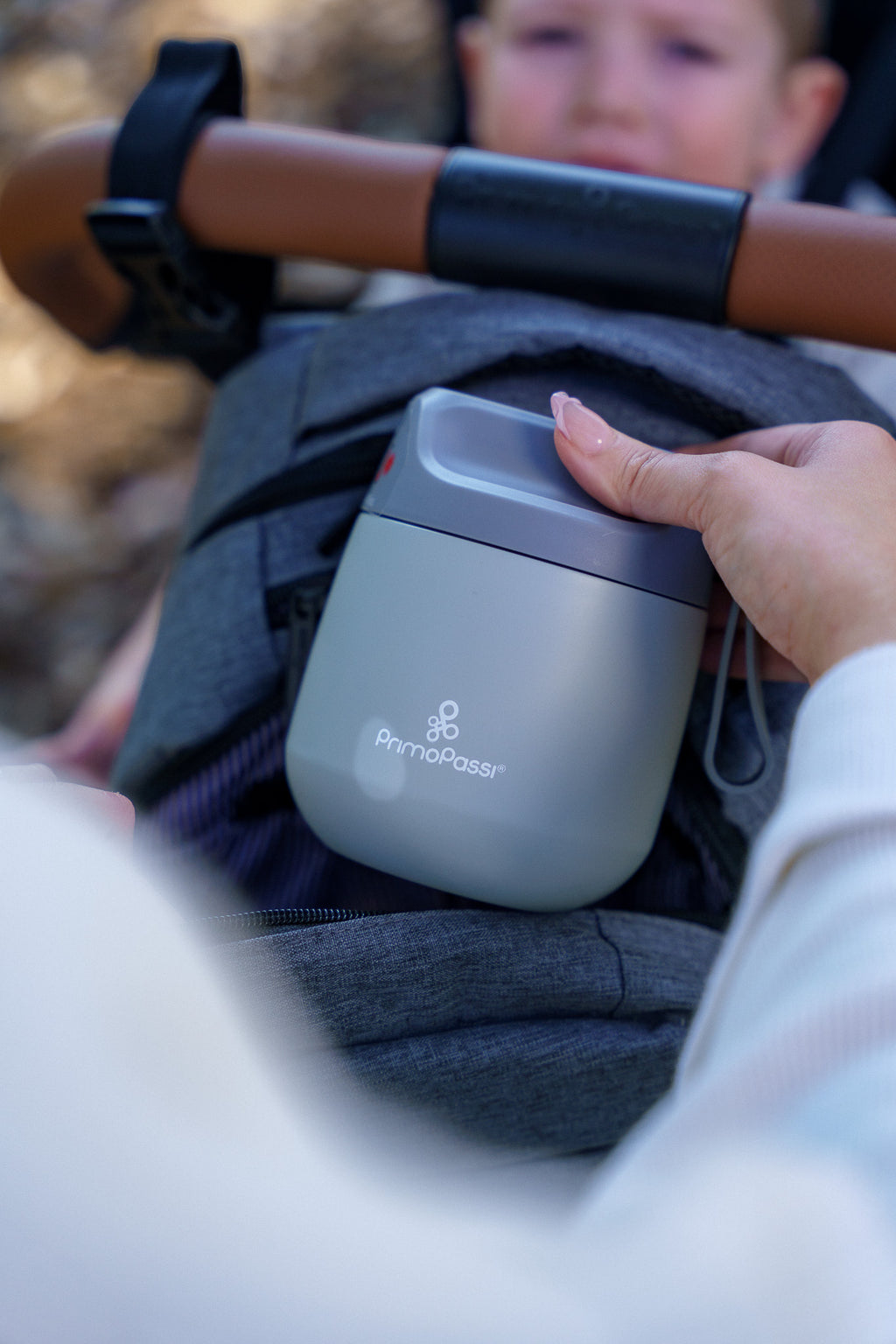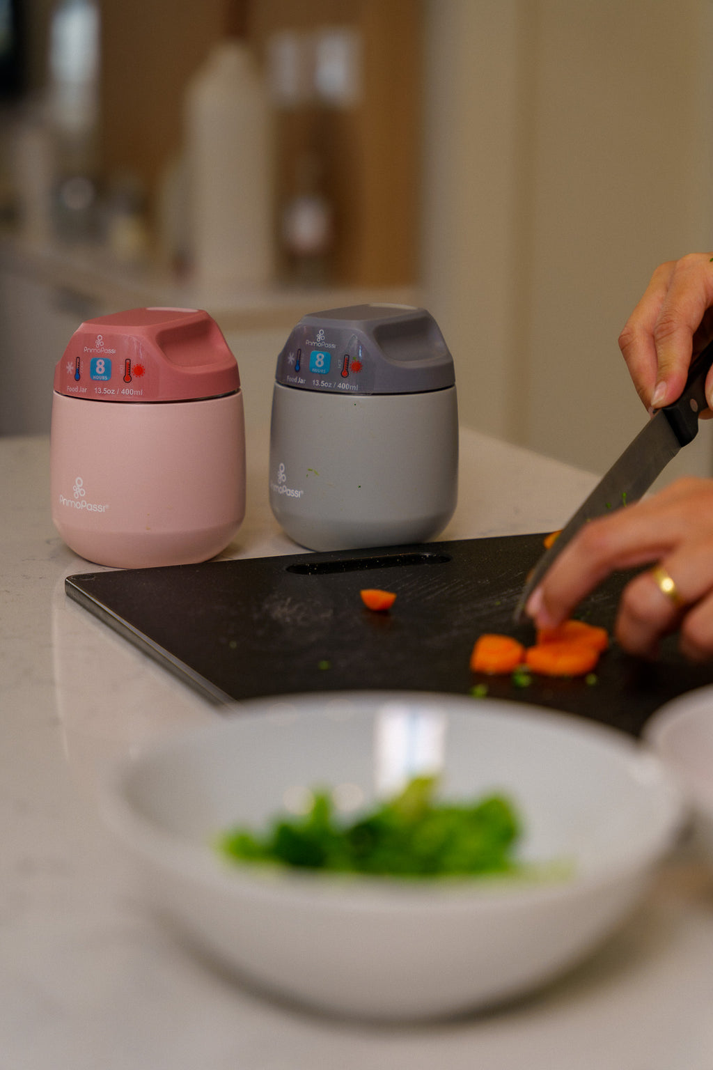 The Primo Passi Insulated Food Jar is the perfect food container for travel or home use. Primo Passi Insulated Food Jars will keep your child's snack, fruit or baby food hot or cold for 8 hours! They feature an easy open twist lid and a silicone strap for easy handling.