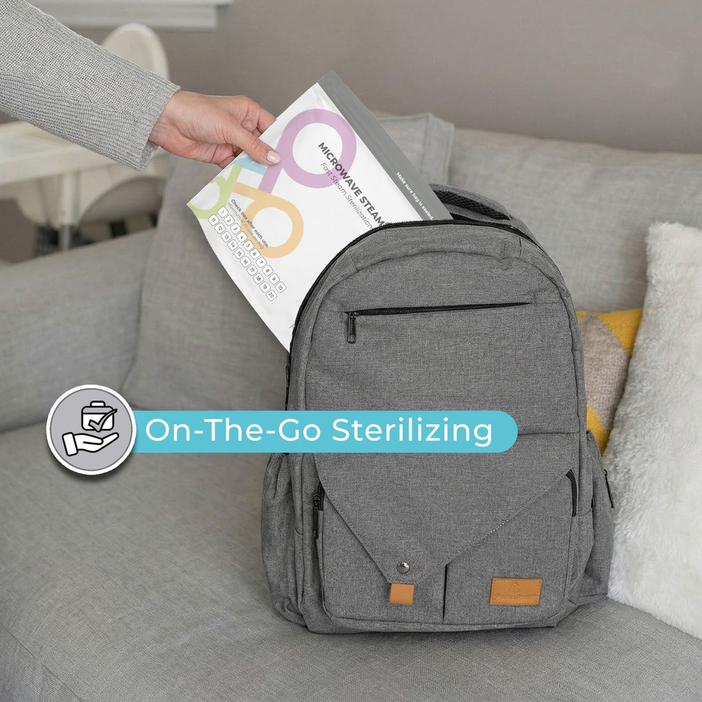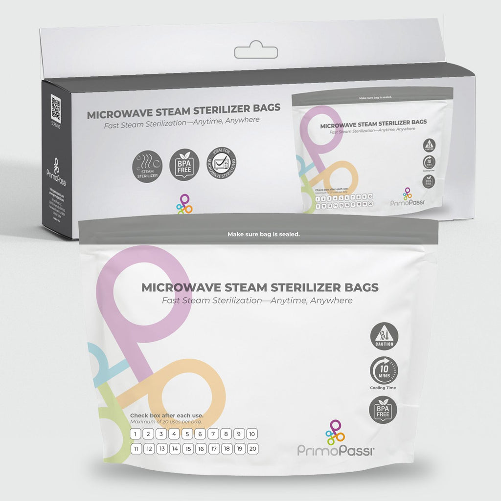 Primo Passi Microwave Steam Sterilizer Bags offer a simple, space-saving solution for steam sterilizing baby feeding accessories at home or while traveling. Designed for parents who value convenience, clarity, and everyday practicality, each box includes 10 BPA-free sterilization bags, with up to 20 uses per bag and built-in check boxes to easily track each use.